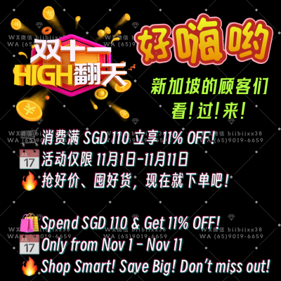 🎊 双11来啦! 🛒 消费满 SGD 110 立享 11% OFF! 📅 活动仅限 11月1日–11月11日 🔥 抢好价、囤好货,现在就下单吧! — 🎉 11.11 MEGA SALE! 🛍 Spend SGD 110 & Get 11% OFF! 📅 O