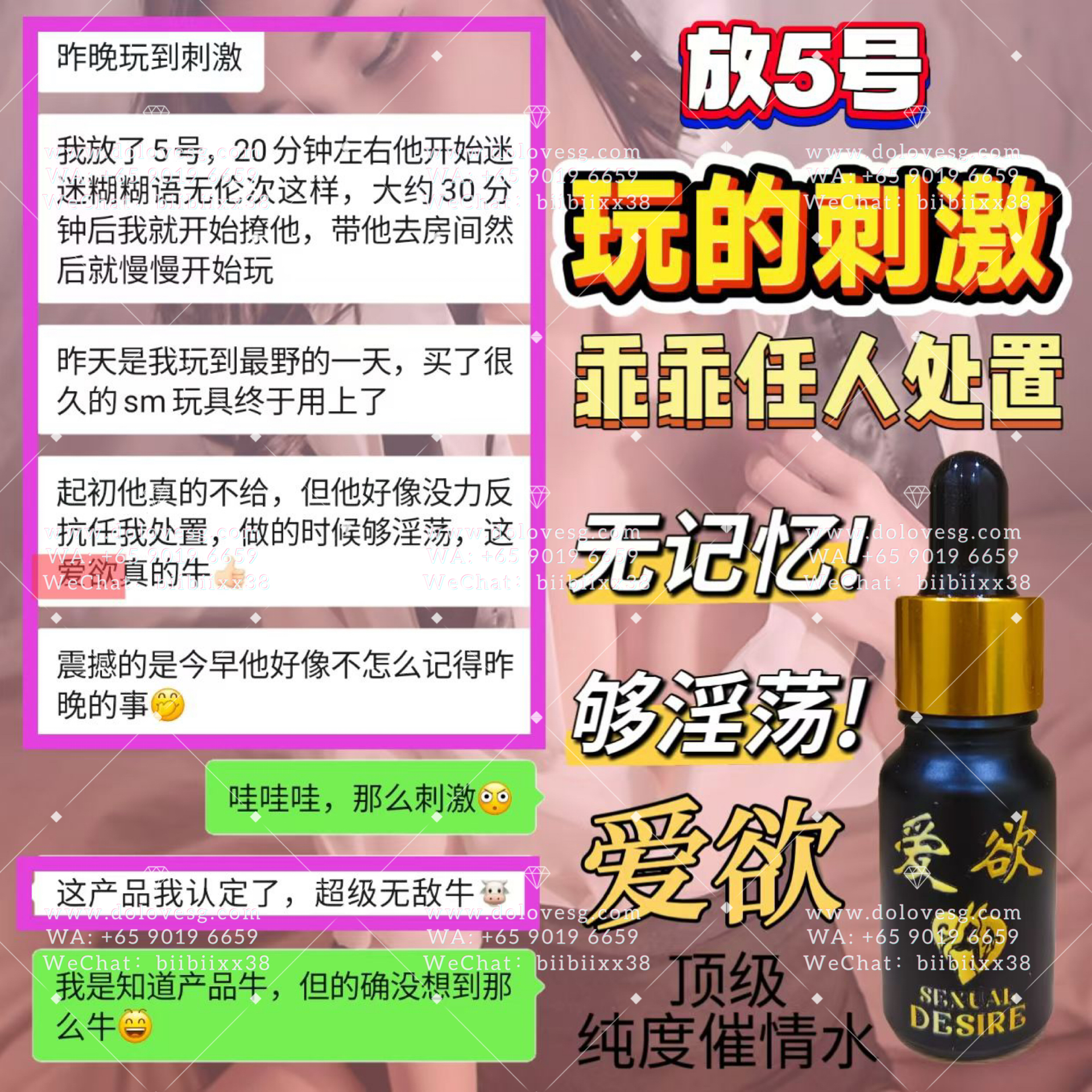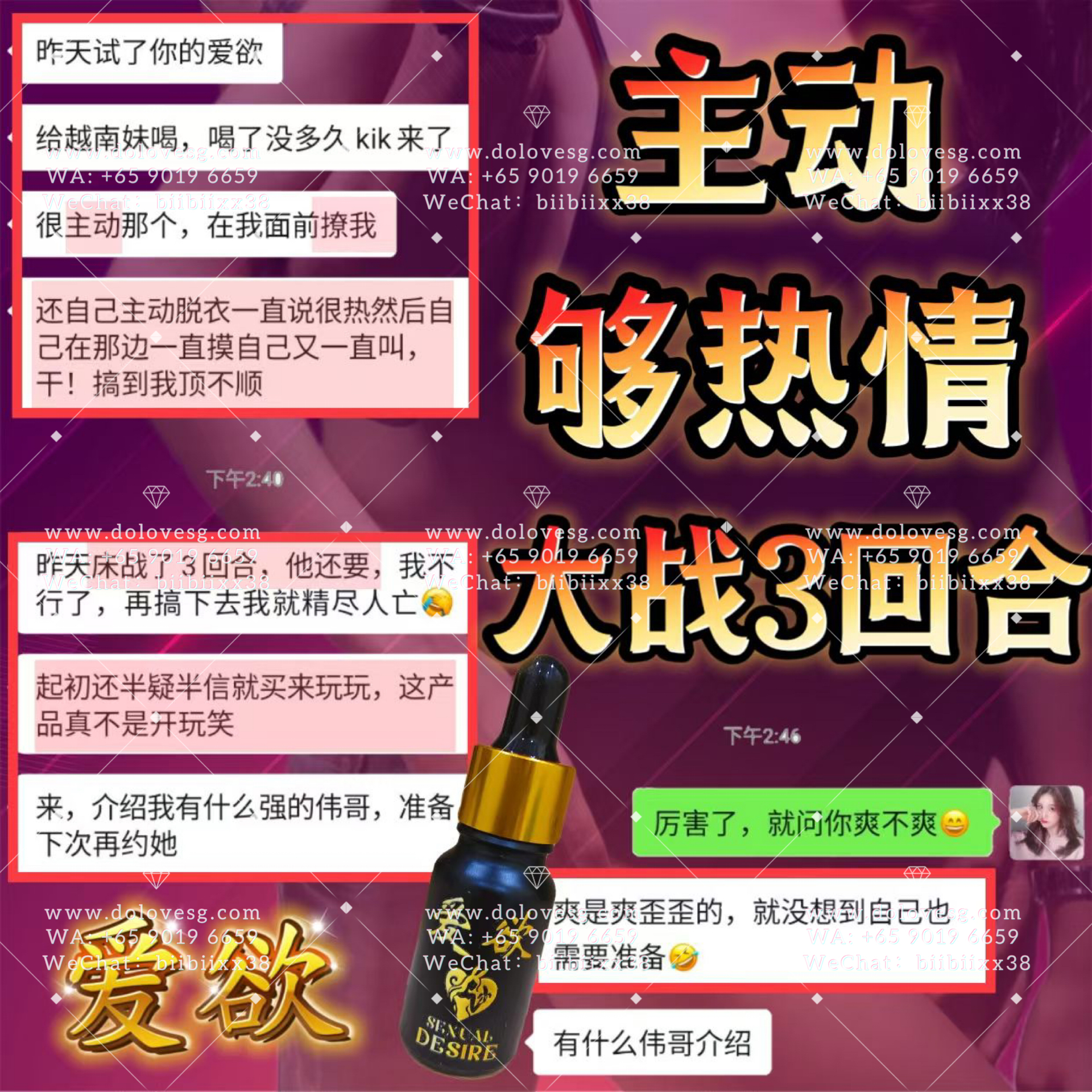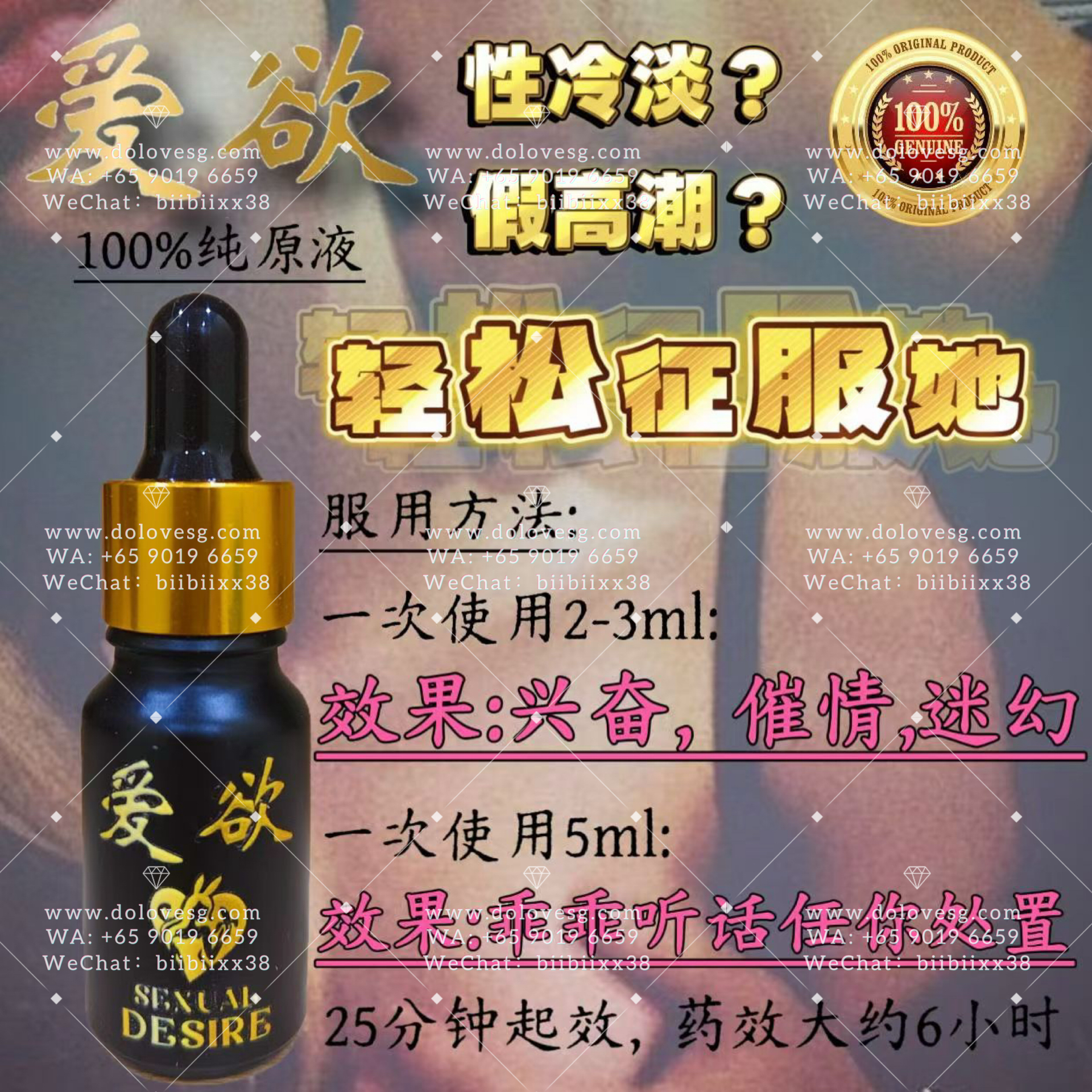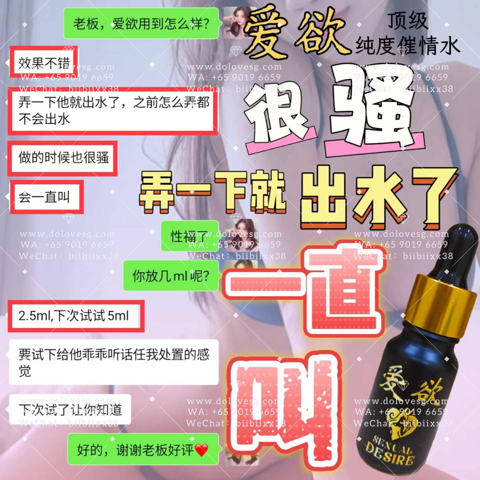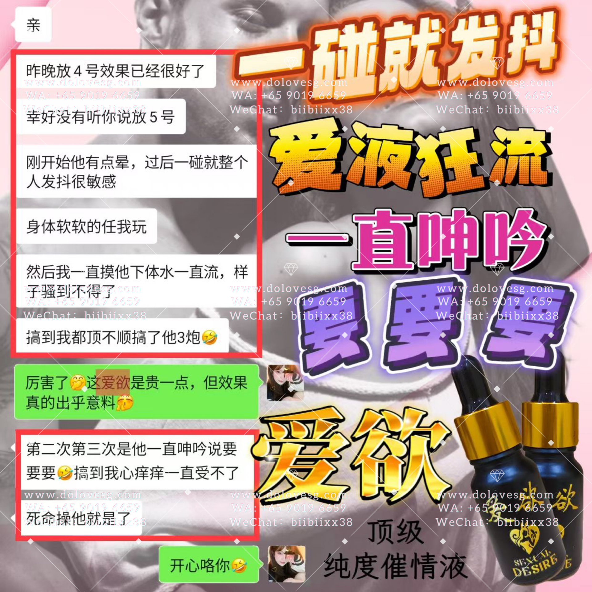 女性饮用数分锺後迅速见效,粉面微红、呼吸急促、氟息灼热、目露渴望、浑身燥热,此时的女性热情奔放,阴道内发痒,急需与你爱爱而不能自拔😇